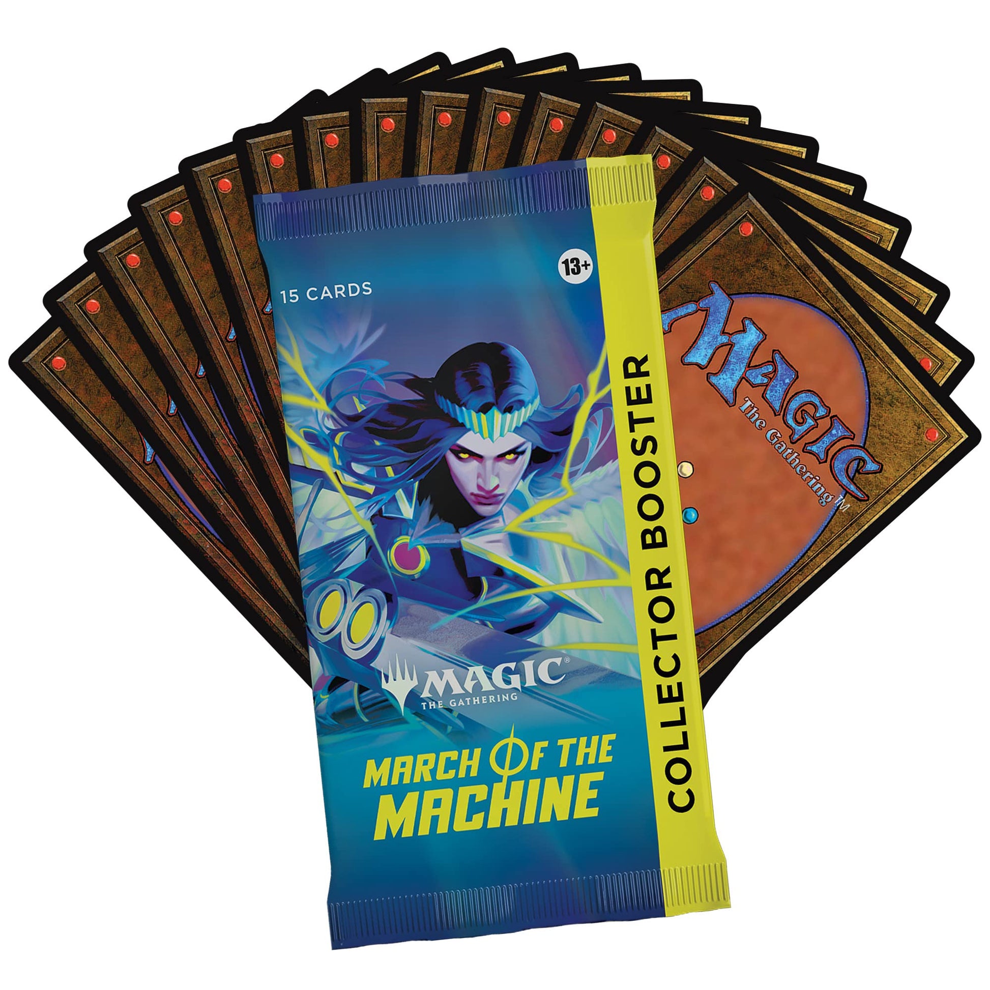 Details: Each March of the Machine Collector Booster contains 15 Magic: The Gathering cards and 1 Traditional Foil double-sided token, with a combination of 5 cards of rarity Rare or higher and 4 Uncommon, 5 Common, and 1 Land cards. Every pack contains a total of 10–12 Traditional Foil cards.