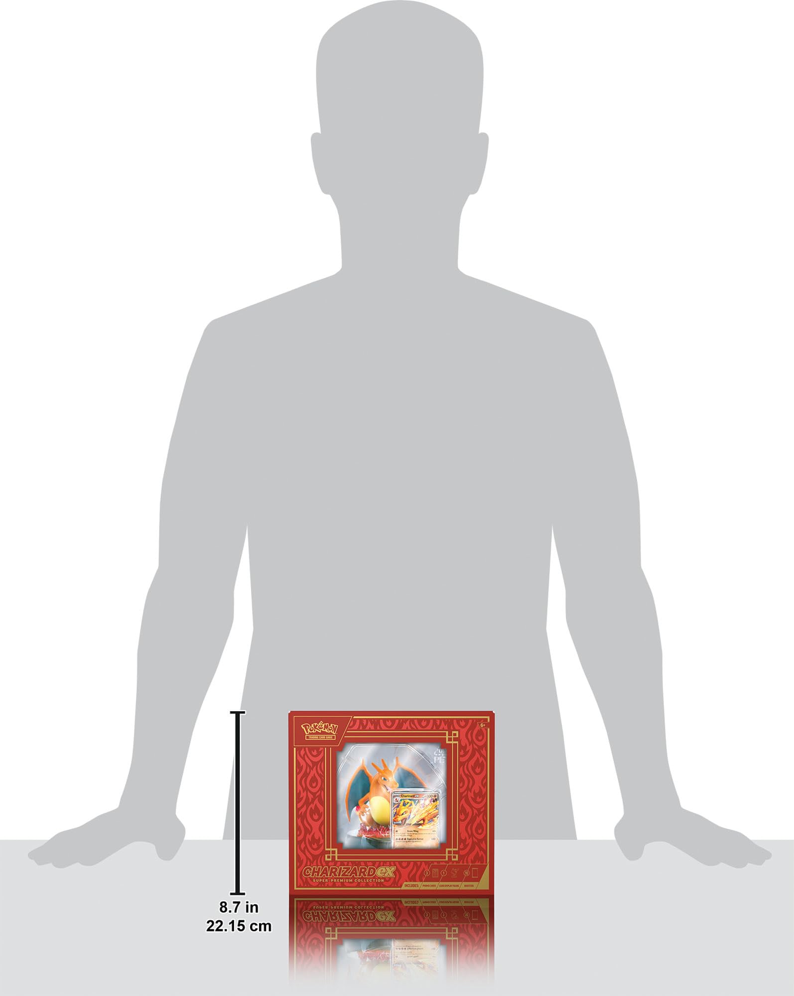 Details: Charizard Guards Your Favorite Card! With explosive attacks and huge HP, Charizard ex has a commanding presence on the battlefield! Bring that burning tenacity to life on your desk, bookcase, or nightstand with an awesome Charizard figure featuring translucent fire effects to show off a favorite card—like the foil Charmander, Charmeleon, or Charizard ex you also get in this collection! Even more fun awaits in a stack of 10 booster packs from different Pokémon TCG expansions.