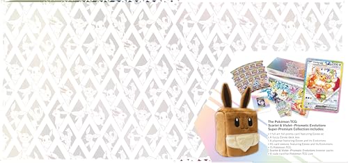 - The Pokémon TCG: Scarlet & Violet—Prismatic Evolutions Super-Premium Collection includes 1 full-art foil promo card featuring Eevee ex, a fuzzy Eevee deck box, and a playmat featuring Eevee and its Evolutions.